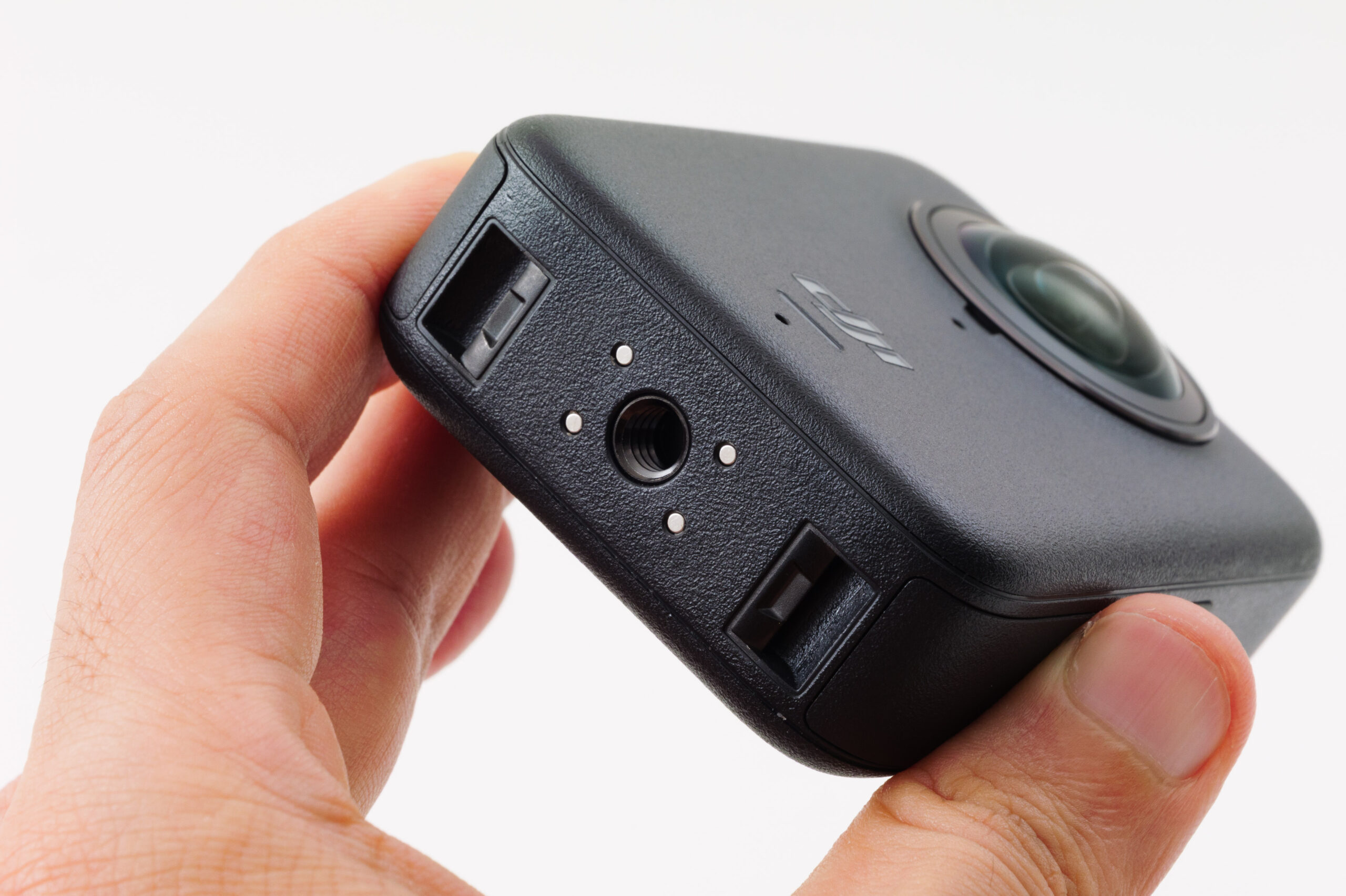 本体重量は183g。ポケットに収まる小型なボディに105GBの内蔵メモリを搭載しています。microSDカードがなくても本体に動画を記録することができます。本体底面には、三脚用のネジ穴が用意されているほか、Osmo Actionシリーズ用のクイックリリースマウントアクセサリーに対応します。また、Osmo Audioに対応しているので、DJI Mic 2やMic Miniとレシーバーレスで接続可能です。
