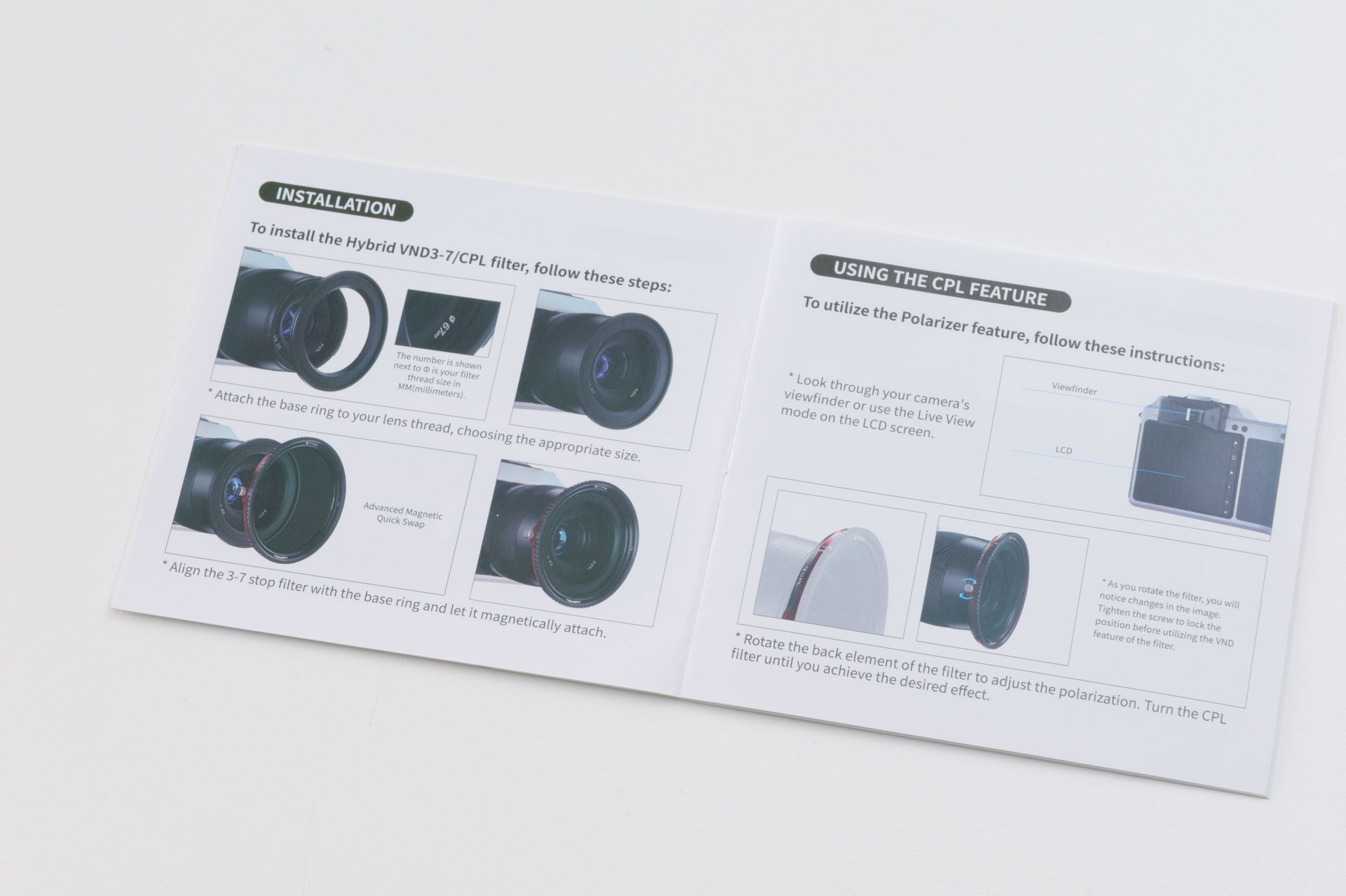 基本セットには、VND/CPLフィルター、ベースリング(82mmサイズ)、表用キャップ、裏用キャップが入っています。