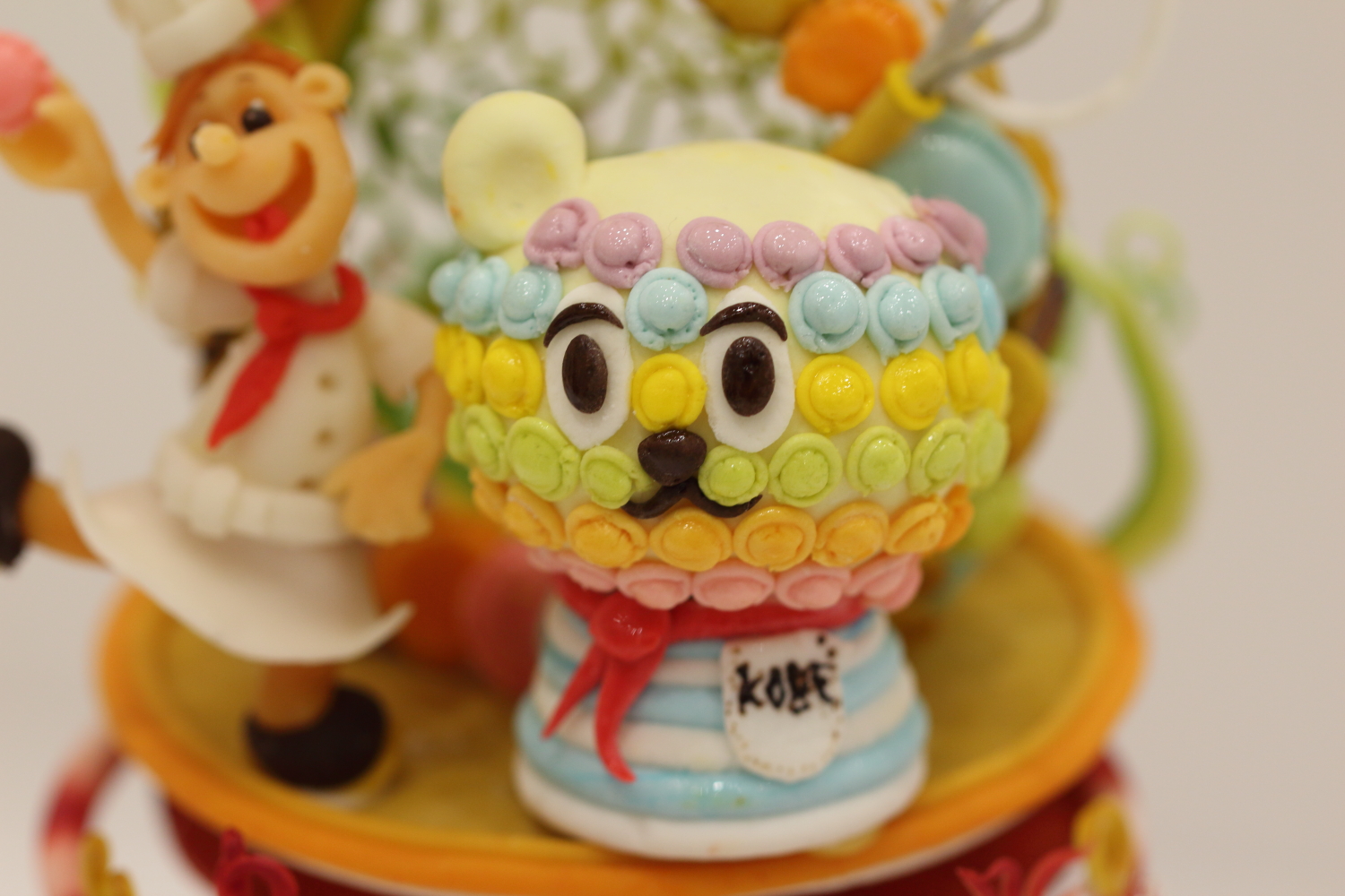 雨ではありませんがスポイトでガーベラの花びらの上にしずくを落として撮影してみました。水滴の中にいるのは神戸のゆるキャラ「コーベアー」です。