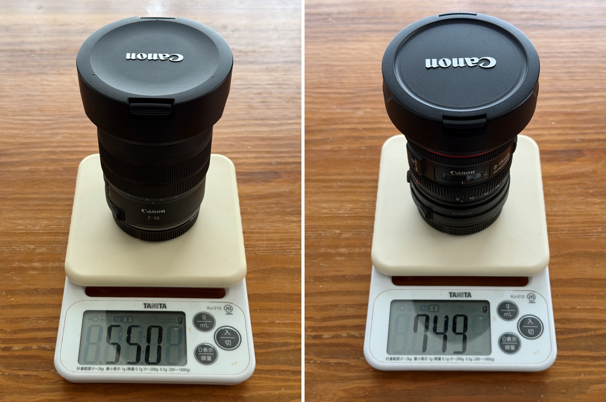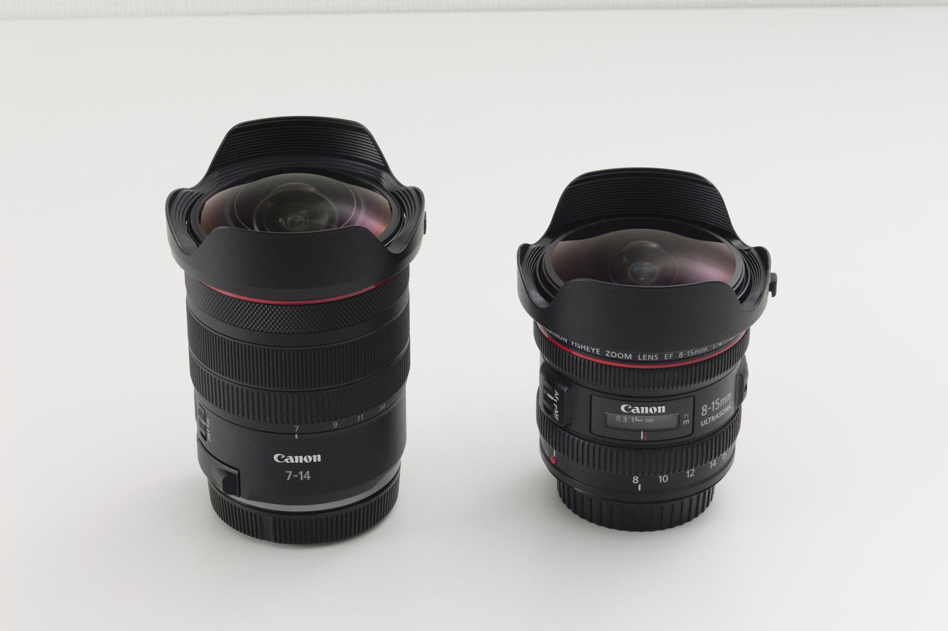 左が旧型の「EF8-15mm F4L フィッシュアイ USM」で15mm、右が新型の「RF7-14mm F2.8-3.5 L FISHEYE STM」で14mm